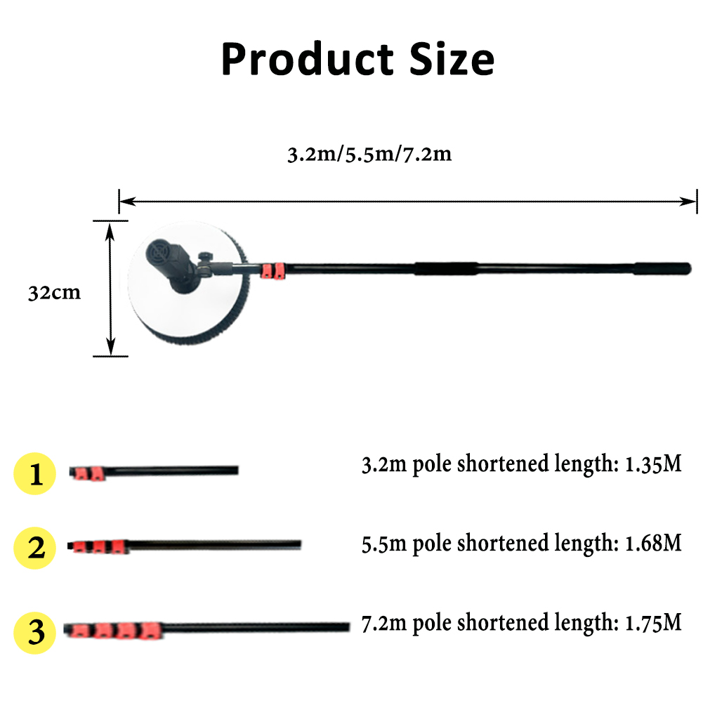 -The single head PV cleaner is more flexible and lighter. The single head PV cleaning brush is easy to clean small areas that cannot be reached by the double head cleaning brush, and it can clean about 0.5 MW of PV plants in a day. 3.2m/5.5m/7.2m telescopic poles are available for selection and can be freely extended and retracted.